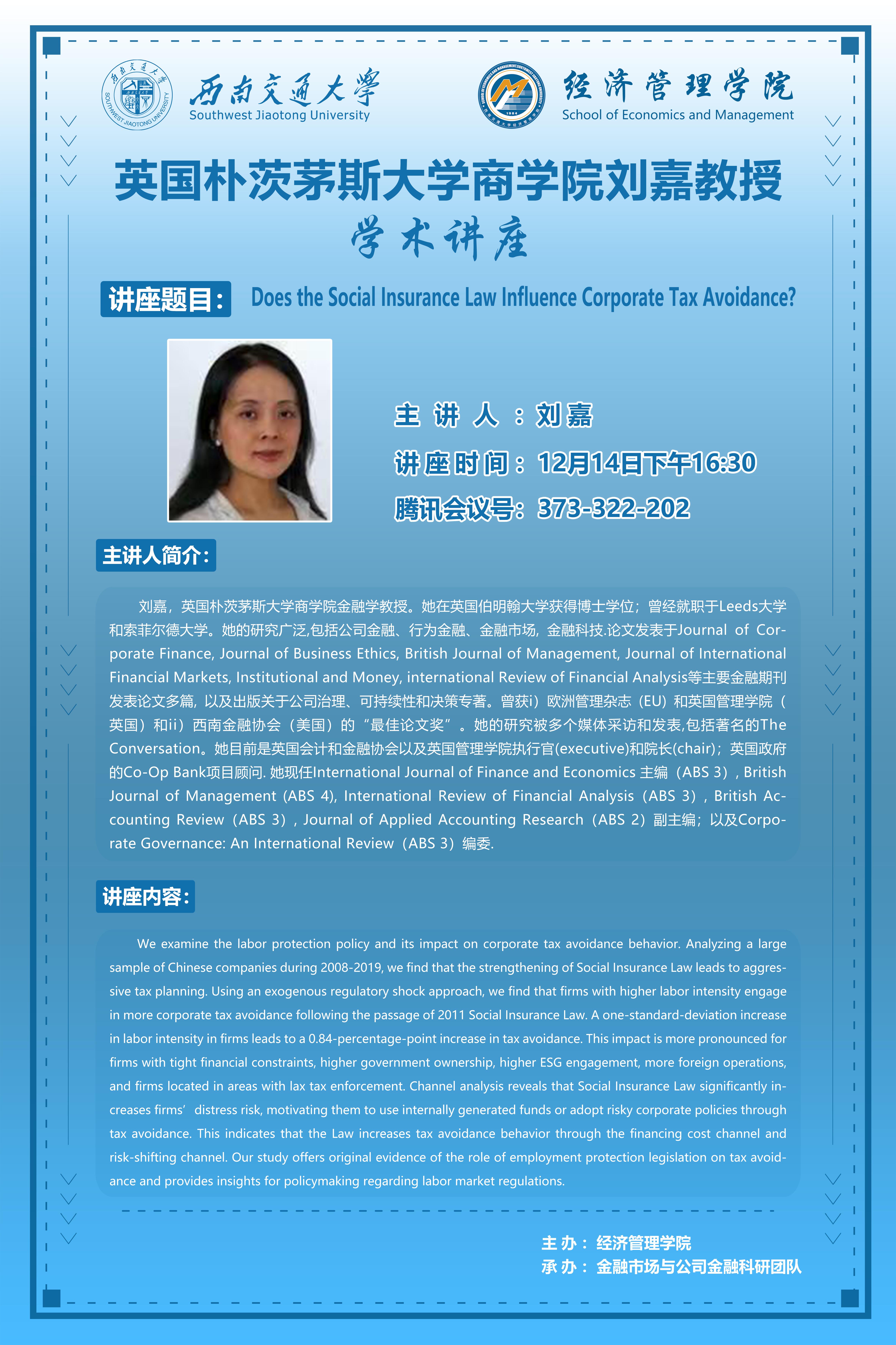 英国朴茨茅斯大学商学院刘嘉教授学术讲座