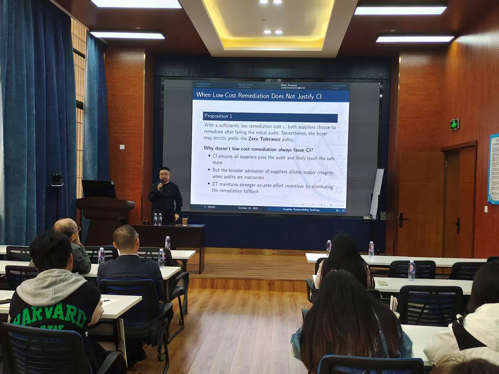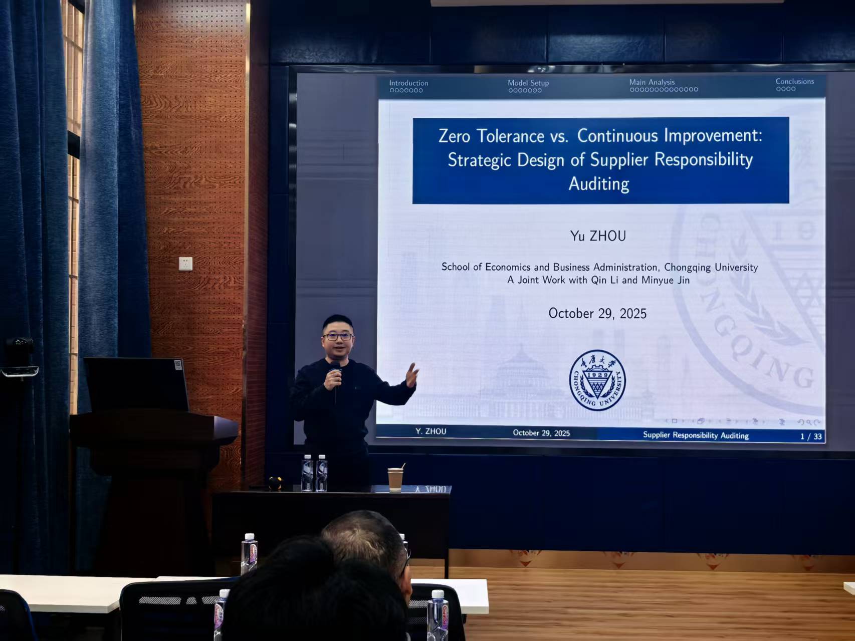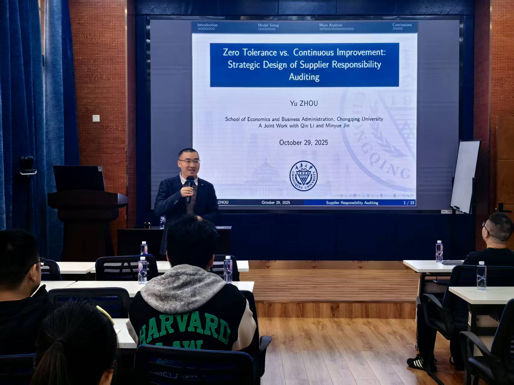 2025年10月31日上午,重庆大学经济与工商管理学院周宇教授应邀在九里校区零号楼0218室为做爱影片师生作题为“Zero Tolerance vs. Continuous Improvement: Strategic Design of Supplier Responsibility Auditing”的学术讲座。本次讲座由学院副院长聂佳佳教授主持,学院多位教师及学生参与此次活动。